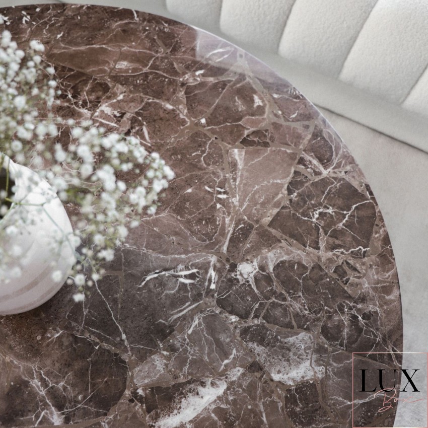 Кружната форма на кафениот природен мермер му дава елегантен карактер на секој ентериер. Идеална маса за кафе... или пак чаша вино.