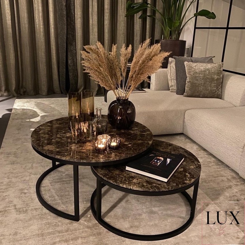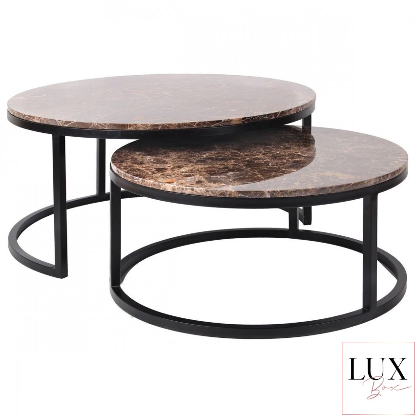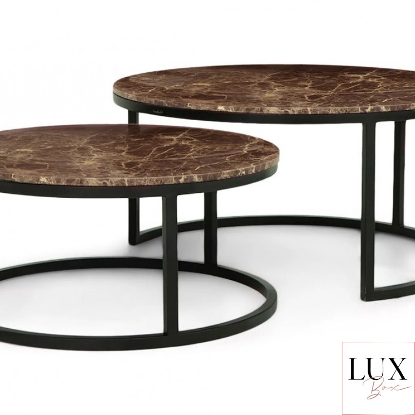 Сет од две маси за кафе кои се вклопуваат една во друга. Елегантна и софистицирана комбинација од кафен природен мермер со округла форма.
