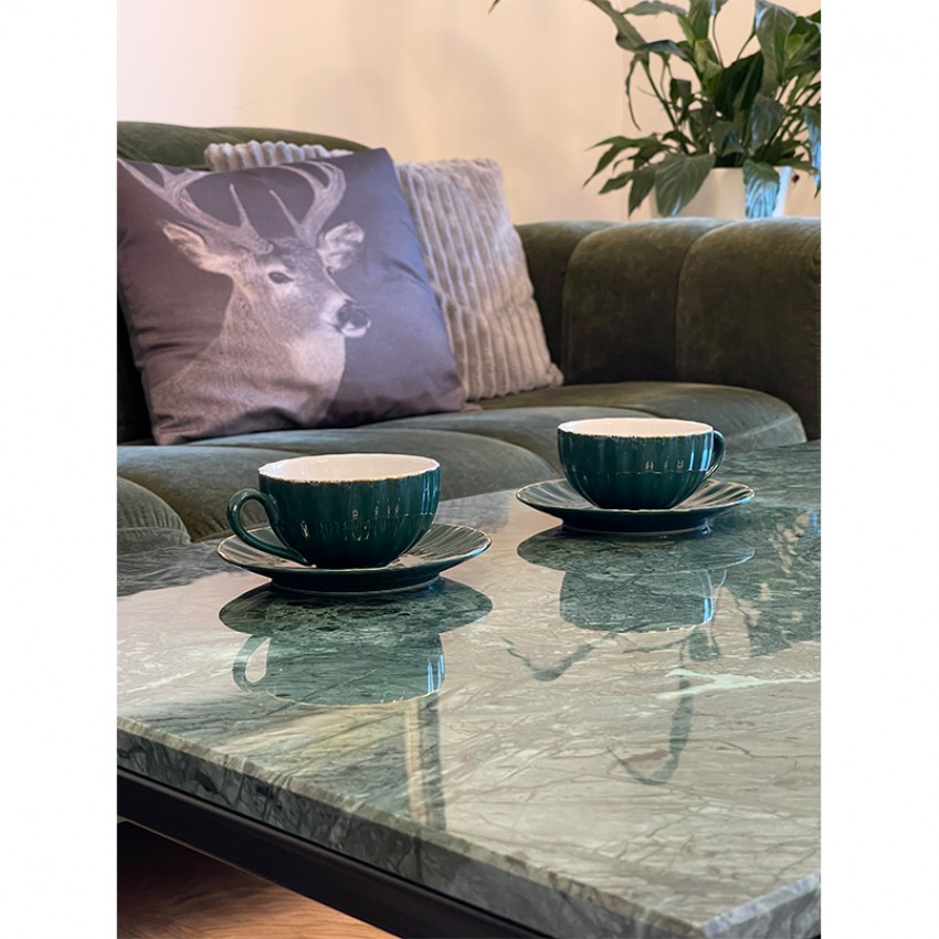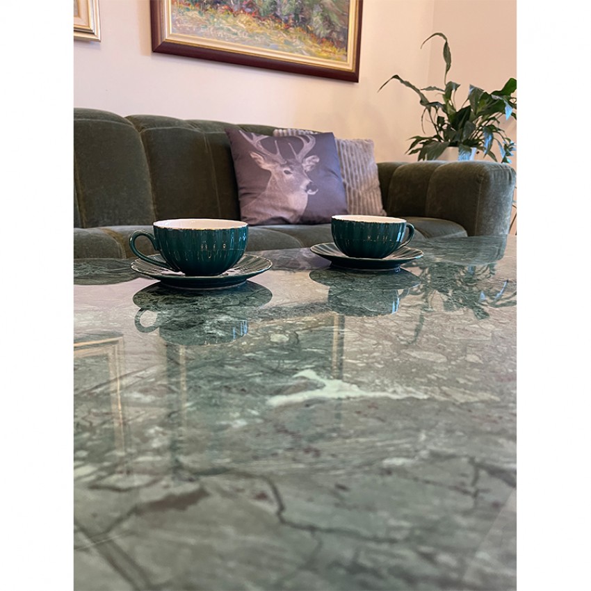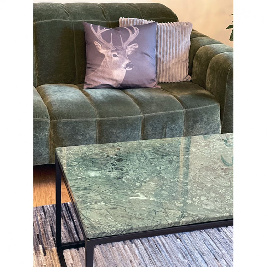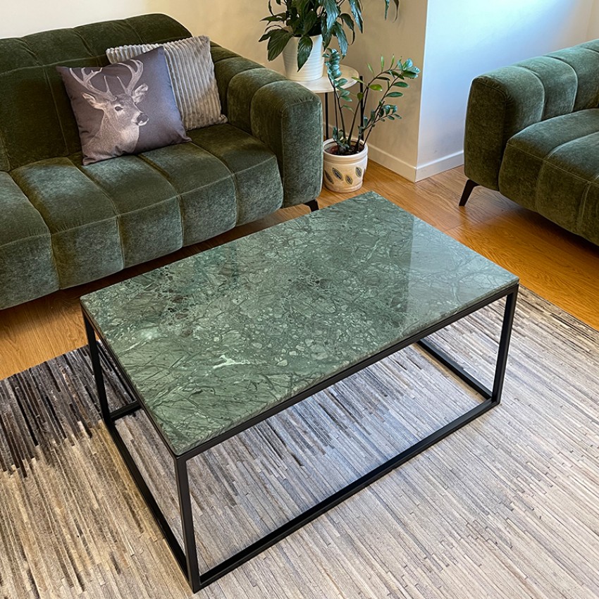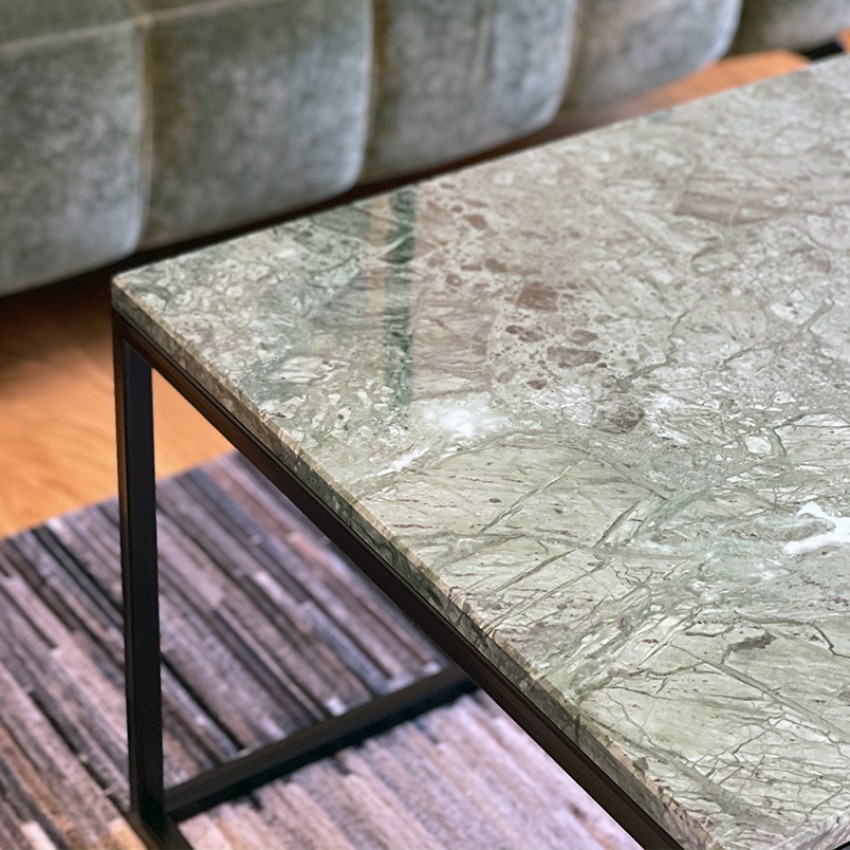 Елегантно и современо парче мебел изработено од зелен природен мермер и црна метална рамка. Идеална маса за кафе која совршено прилега во секој ентериер.