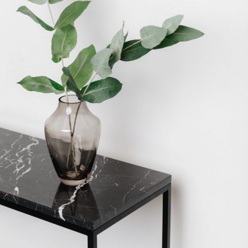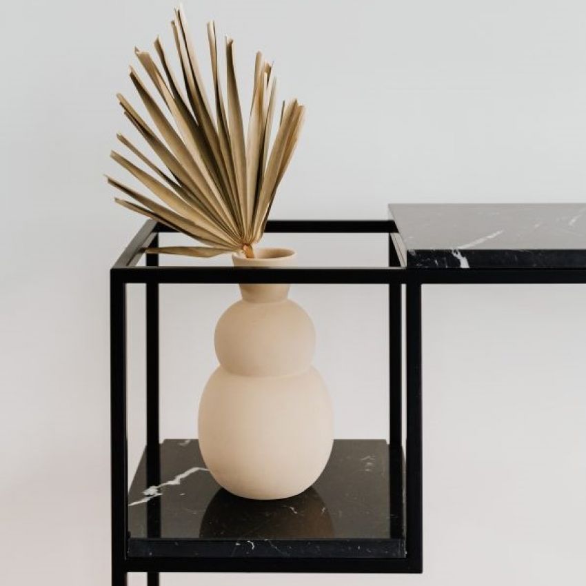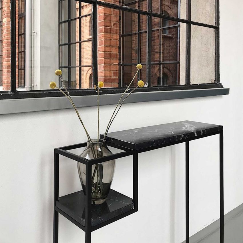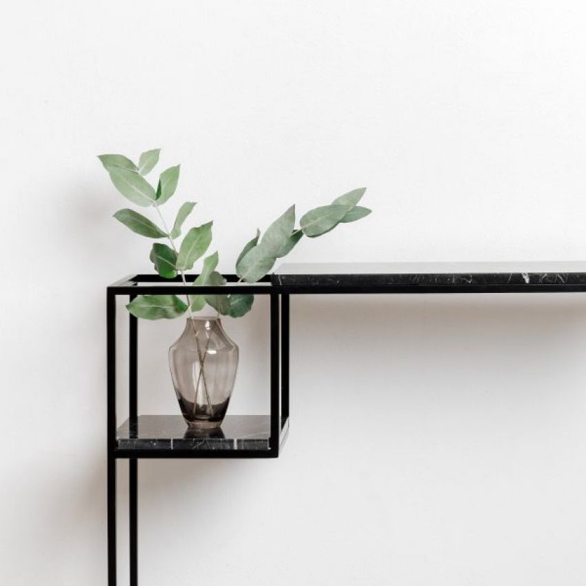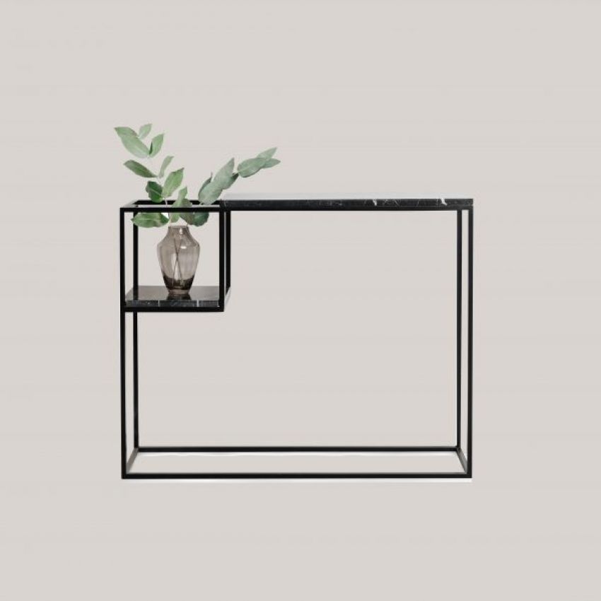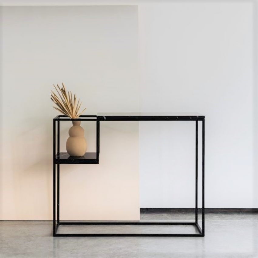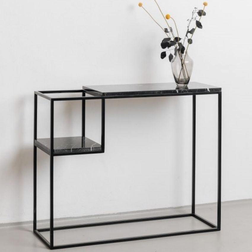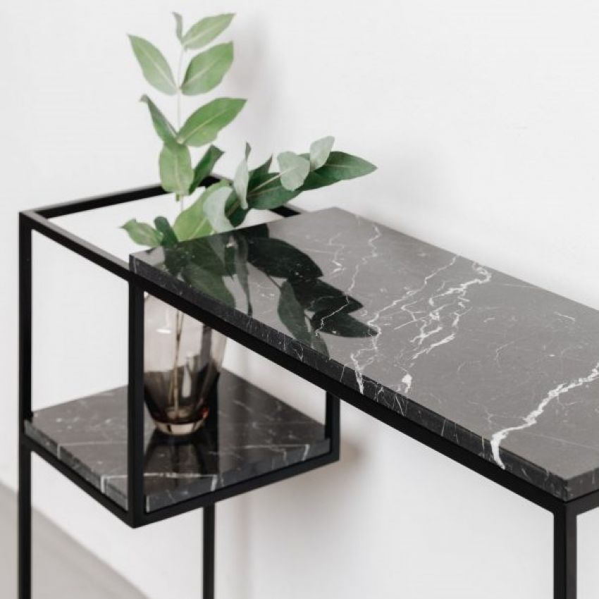 Конзола изработена од црн природен мермер и црна метална рамка. Идеално парче мебел за во ходник, дневна, трпезарија или спална соба. Долната полица на конзолата декорирајте ја со украсен сад со Вашето омилено цвеќе.