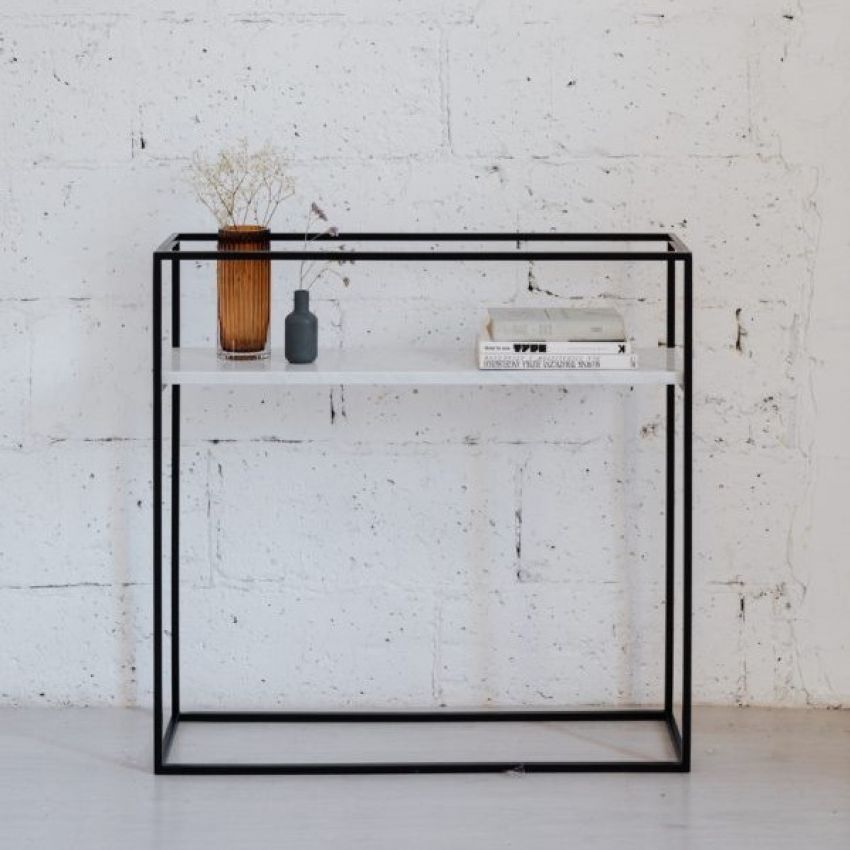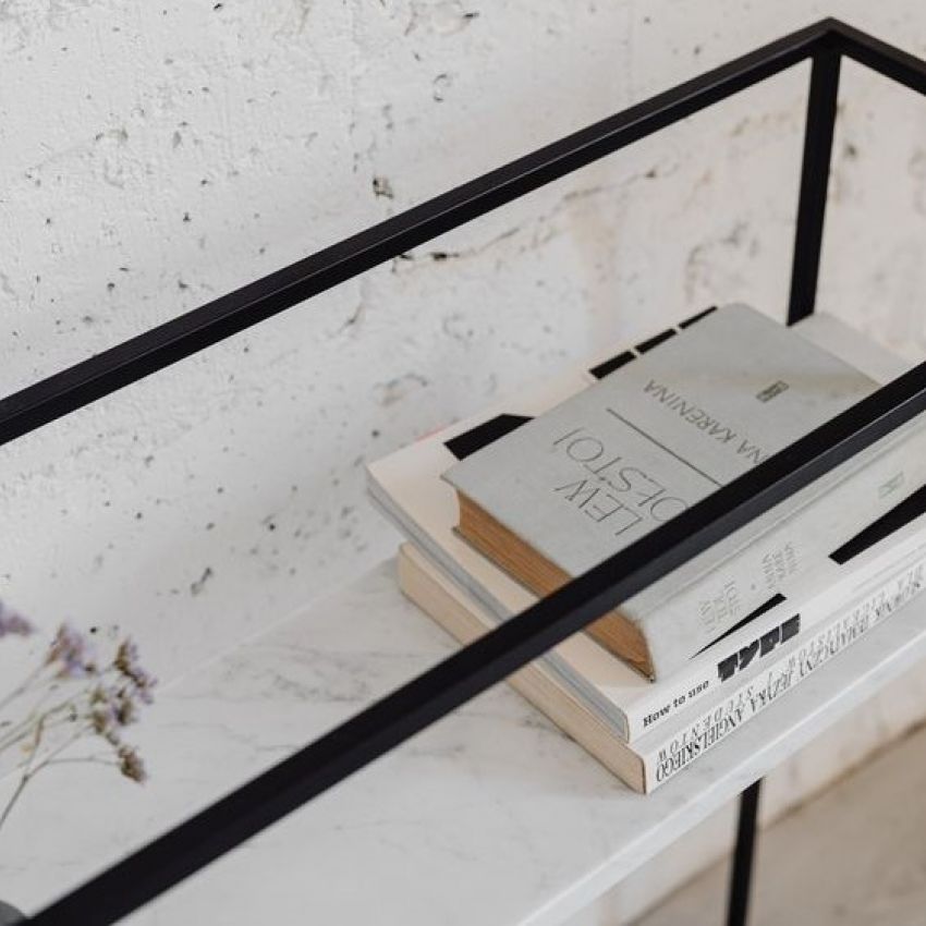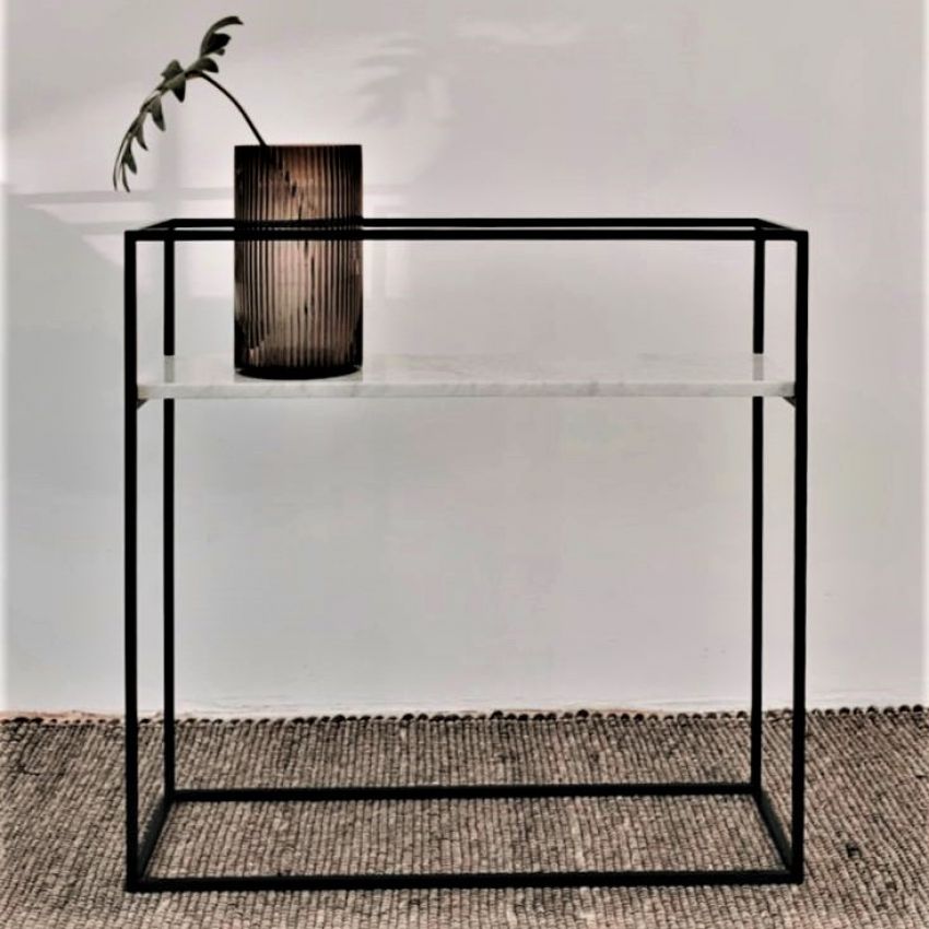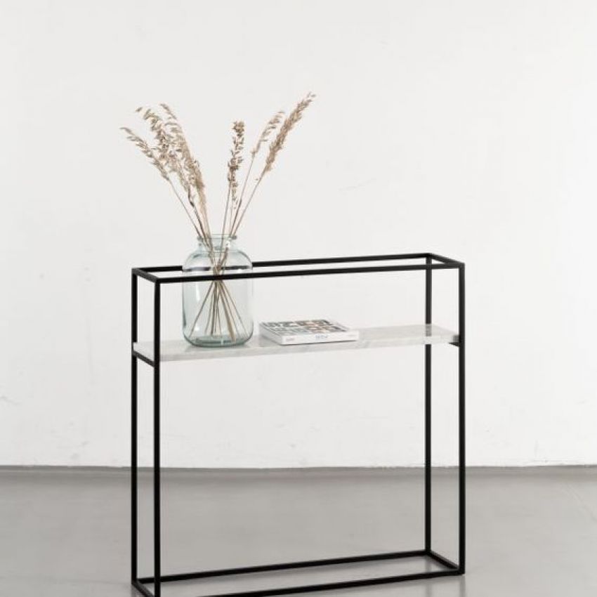 Конзола изработена од бел природен мермер и црна метална рамка. Идеално парче мебел за во ходник, дневна, трпезарија или спална соба. Декорирајте ја со украсен сад со цвеќе, свеќи и неколку книги.