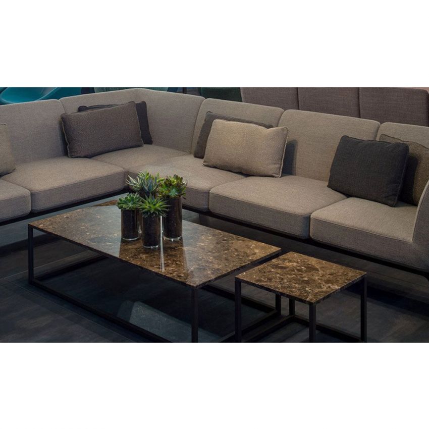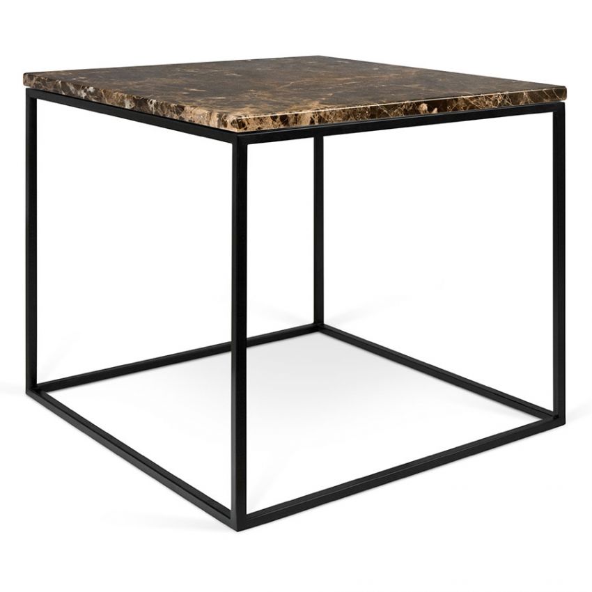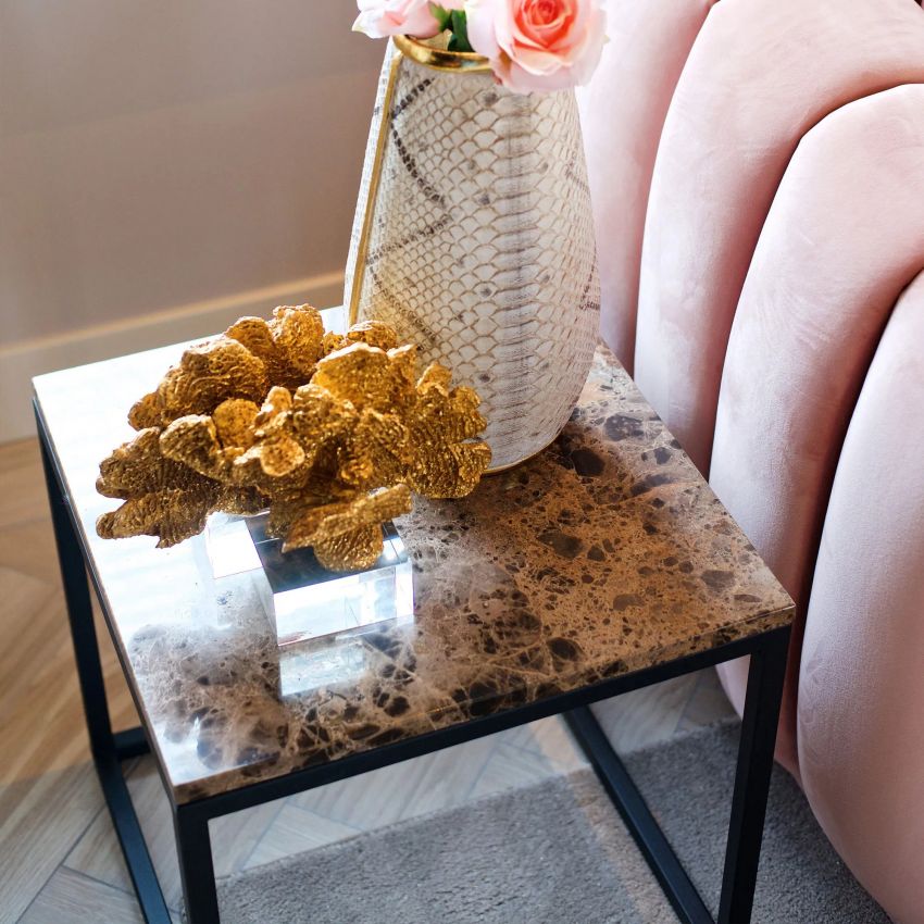 Елегантно и современо парче мебел изработено од кафен природен мермер и црна метална рамка. Идеална маса за кафе или странична масичка која совршено прилега во секој ентериер.