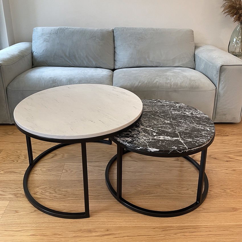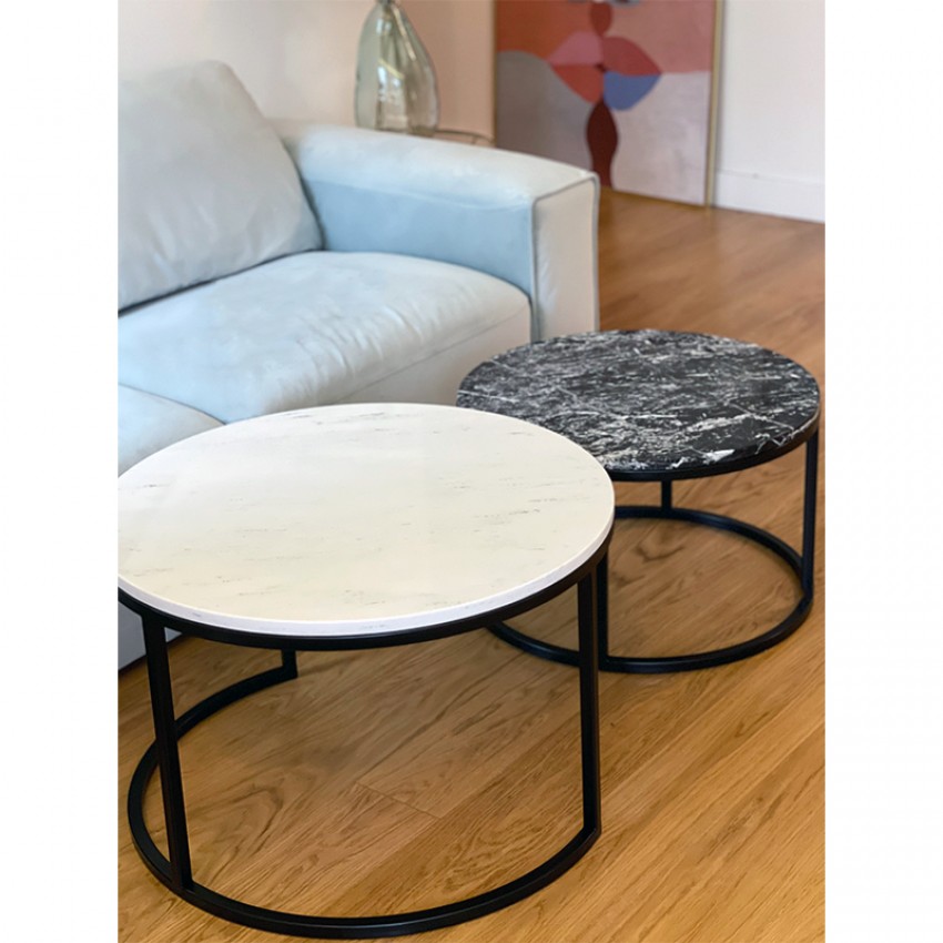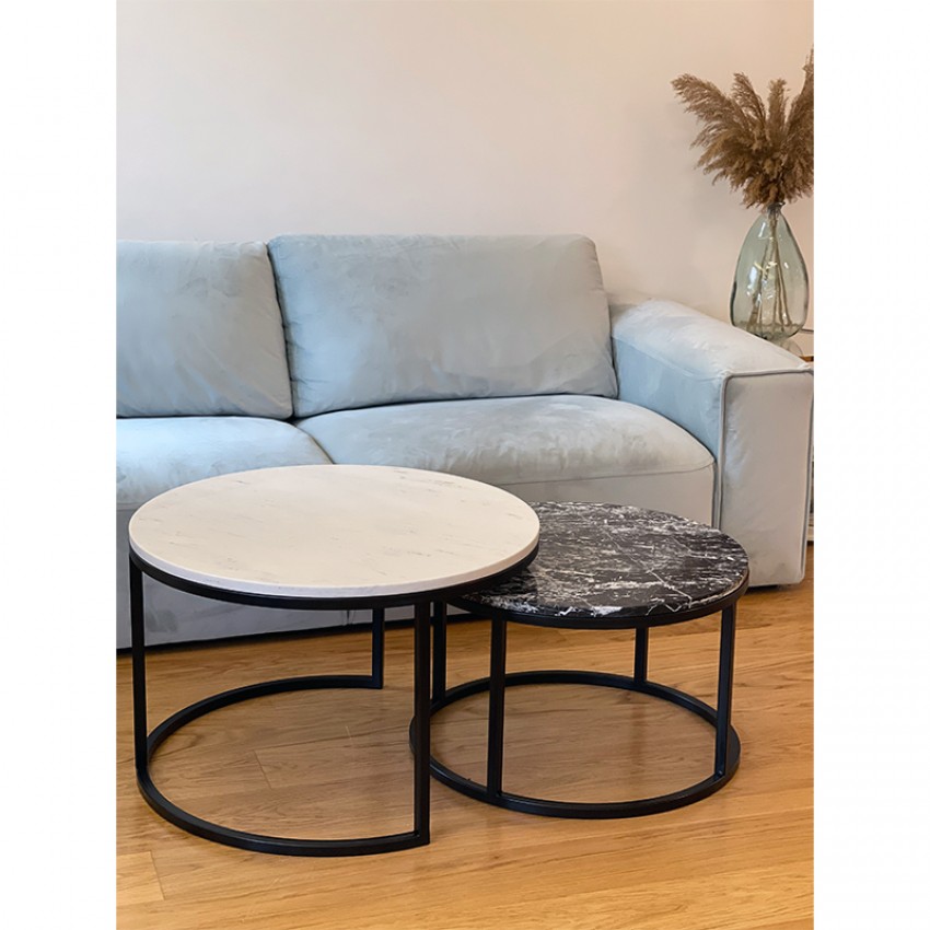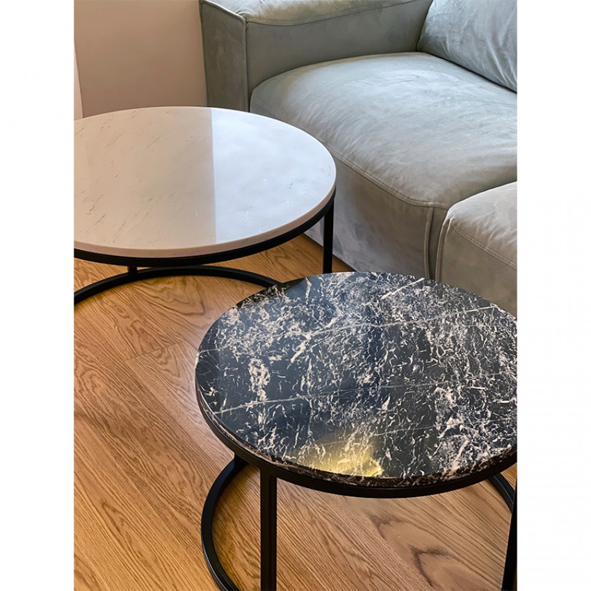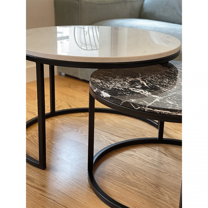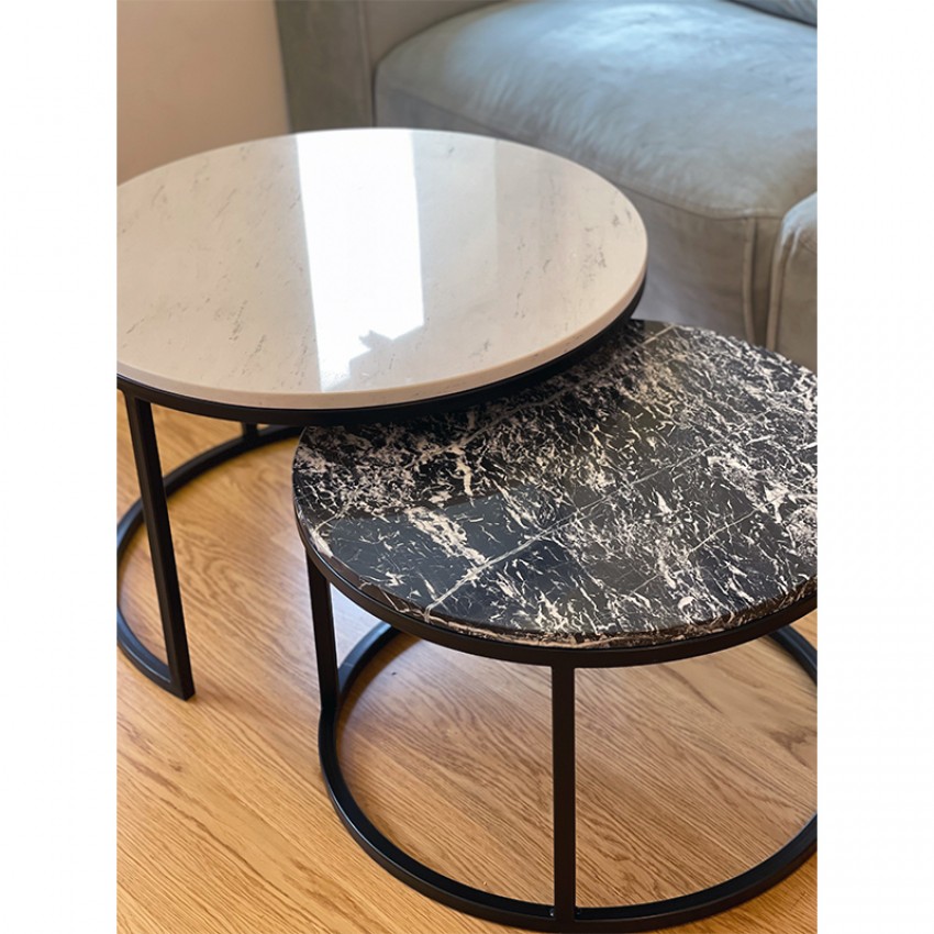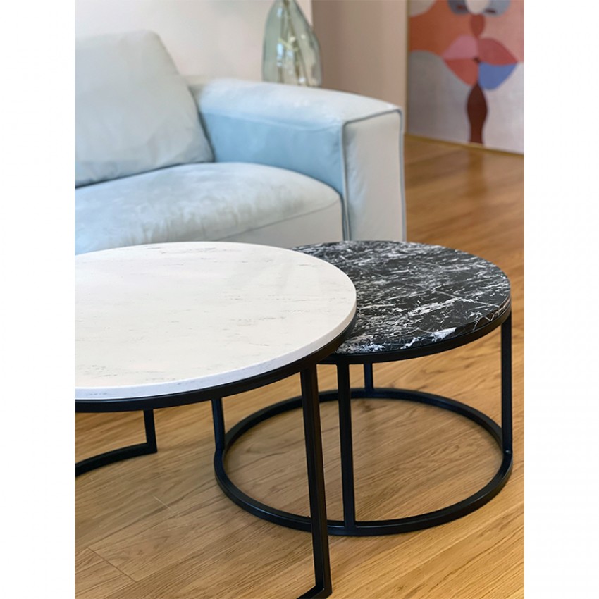 Сет од две маси за кафе кои се вклопуваат една во друга. Елегантна и софистицирана комбинација од бел и црн природен мермер со округла форма.