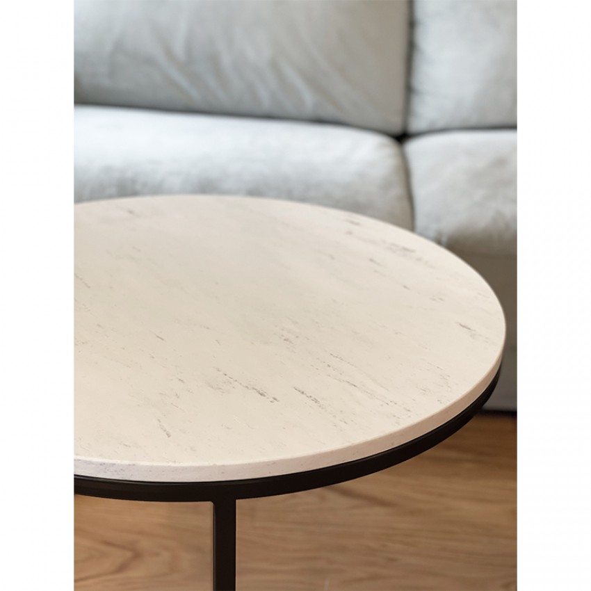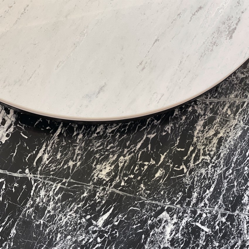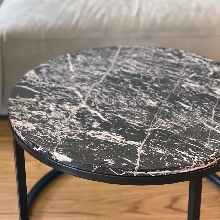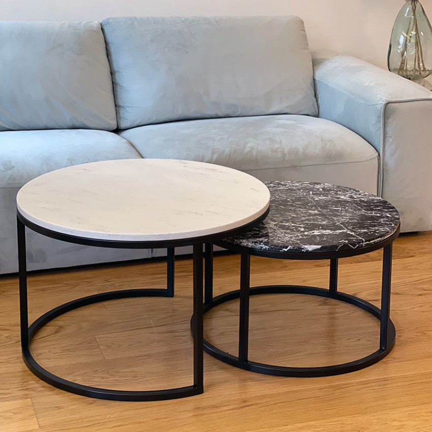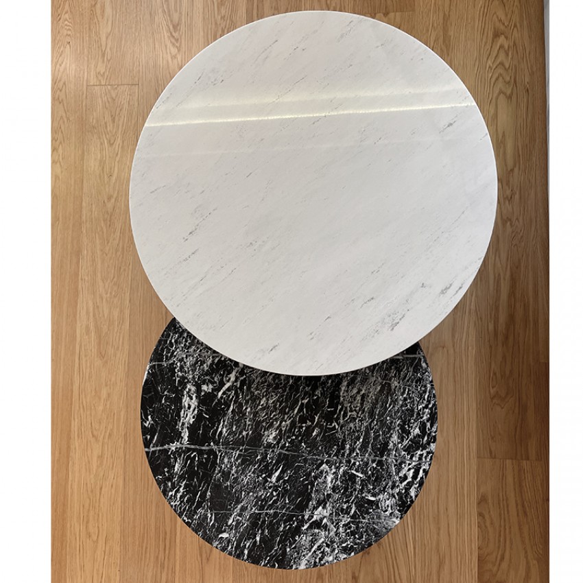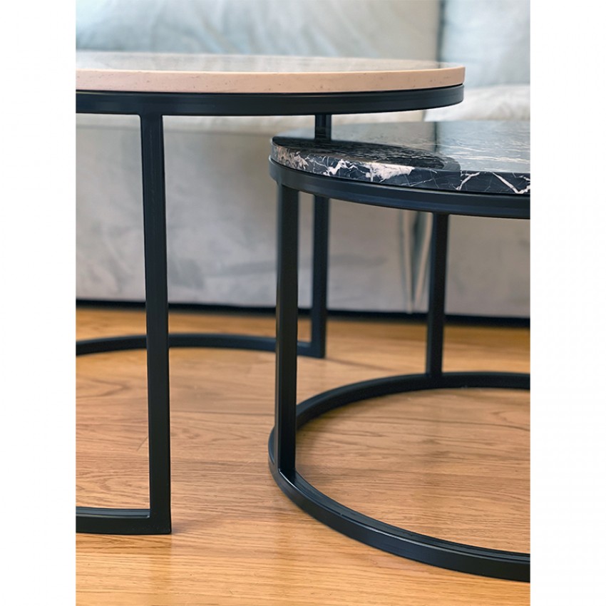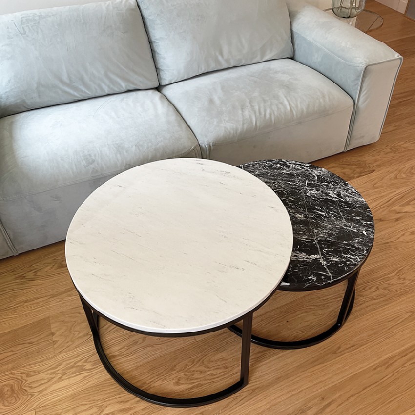 Сет од две маси за кафе кои се вклопуваат една во друга. Елегантна и софистицирана комбинација од бел и црн природен мермер со округла форма.